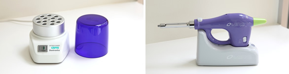 当院では、「塗る麻酔薬」や「麻酔を温める」機器(下の左の写真)、無痛で注射が可能な「電動注射器」(下の右の写真)を導入しております。麻酔の針はもっとも細い33Gの針を使用し、痛みへ可能な限りの対策をしています。